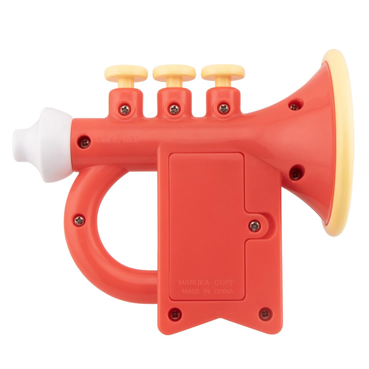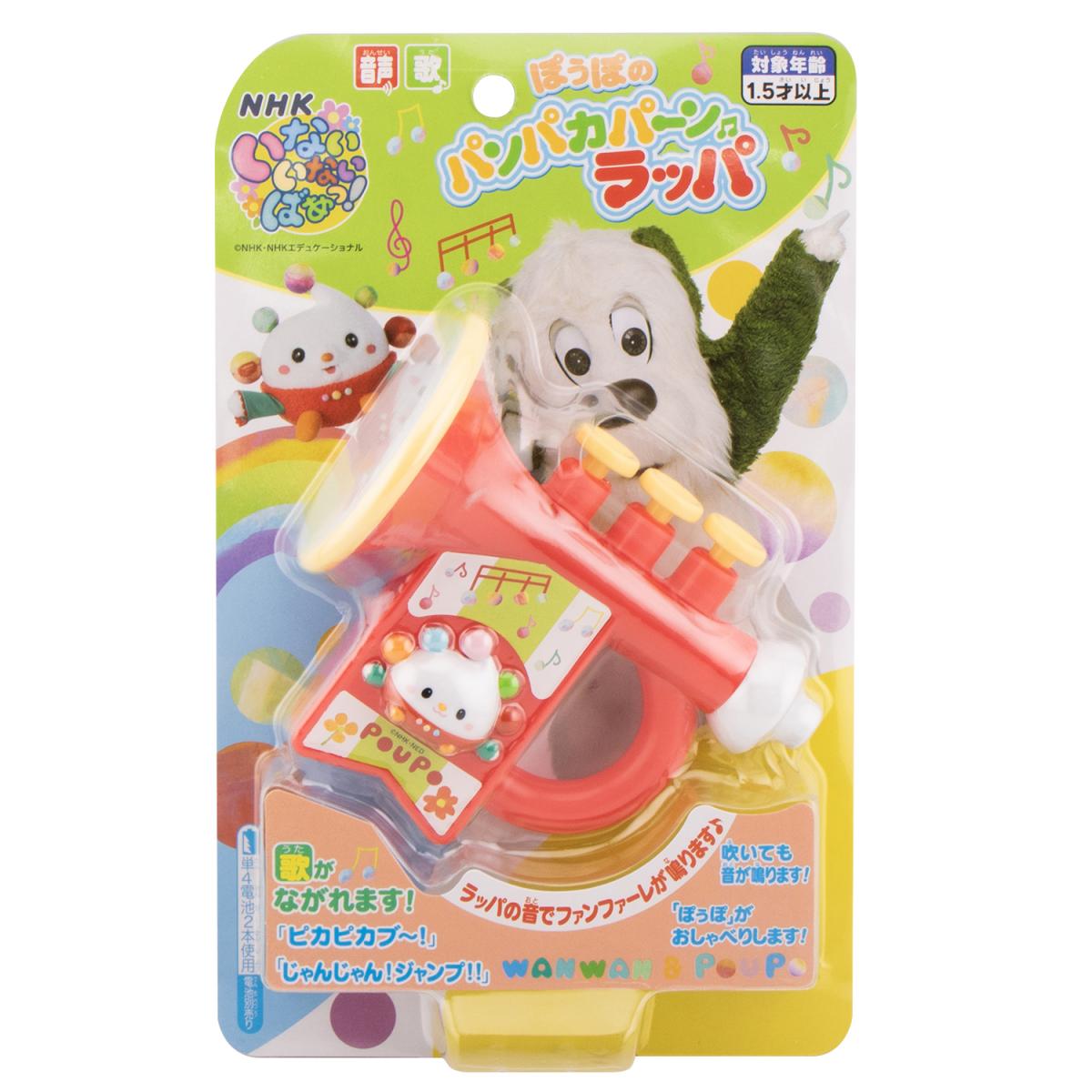 ボタンを押すとラッパの音でファンファーレや番組の歌「ピカピカブ〜!」「じゃんじゃん!ジャンプ!!」を演奏します。「ぽぅぽ」のおしゃべり10種類が鳴ります。実際に吹いても音が鳴ります。機能満載のラッパのおもちゃです。