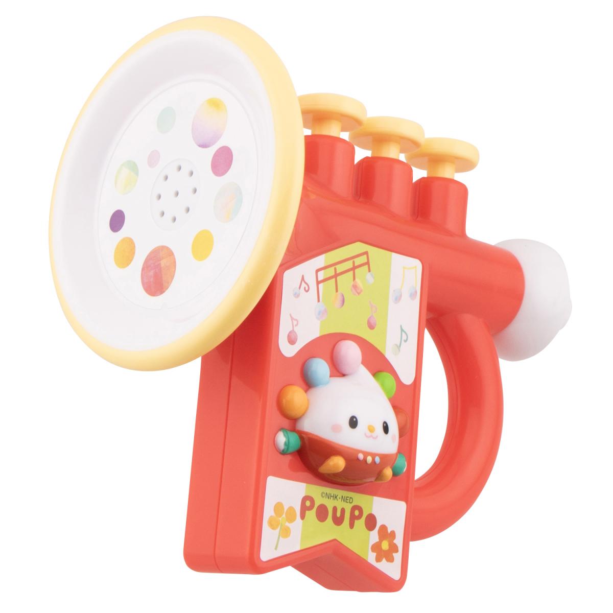 ボタンを押すとラッパの音でファンファーレや番組の歌「ピカピカブ〜!」「じゃんじゃん!ジャンプ!!」を演奏します。「ぽぅぽ」のおしゃべり10種類が鳴ります。実際に吹いても音が鳴ります。機能満載のラッパのおもちゃです。