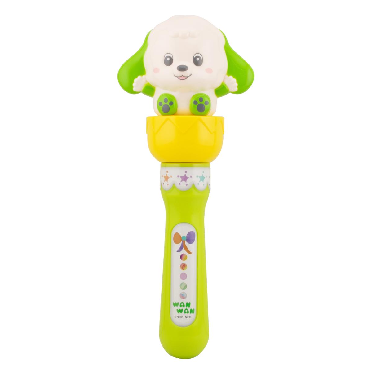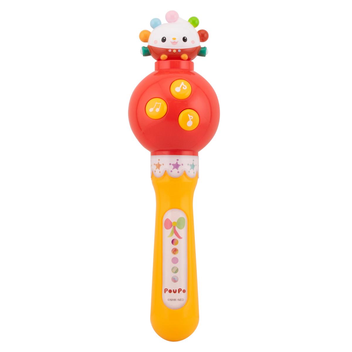 ボタンを押すと番組の歌「ピカピカブ〜!」「キランキランびろ〜ん!」を演奏します。「ぽぅぽ」のおしゃべりが鳴ります。振るとシャカシャカ音が鳴ります。