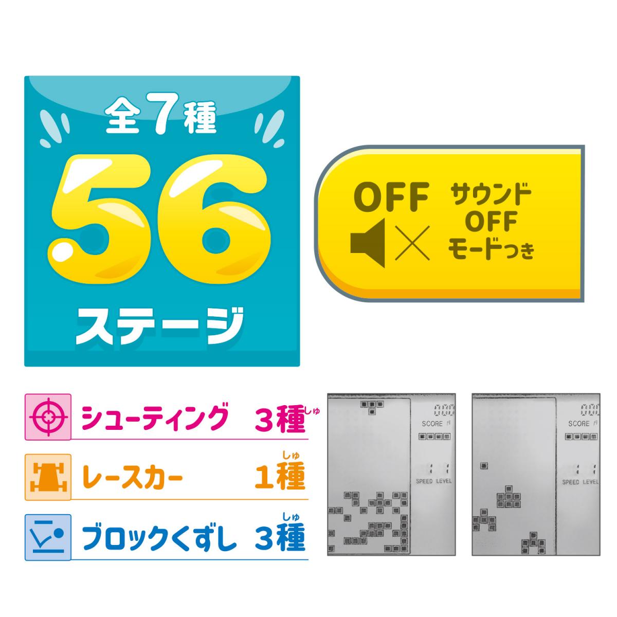 7つのゲーム、全56ステージをお楽しみいただけます。レベルやスピードは個別に調整可能で、サウンドのオン/オフも設定できます。